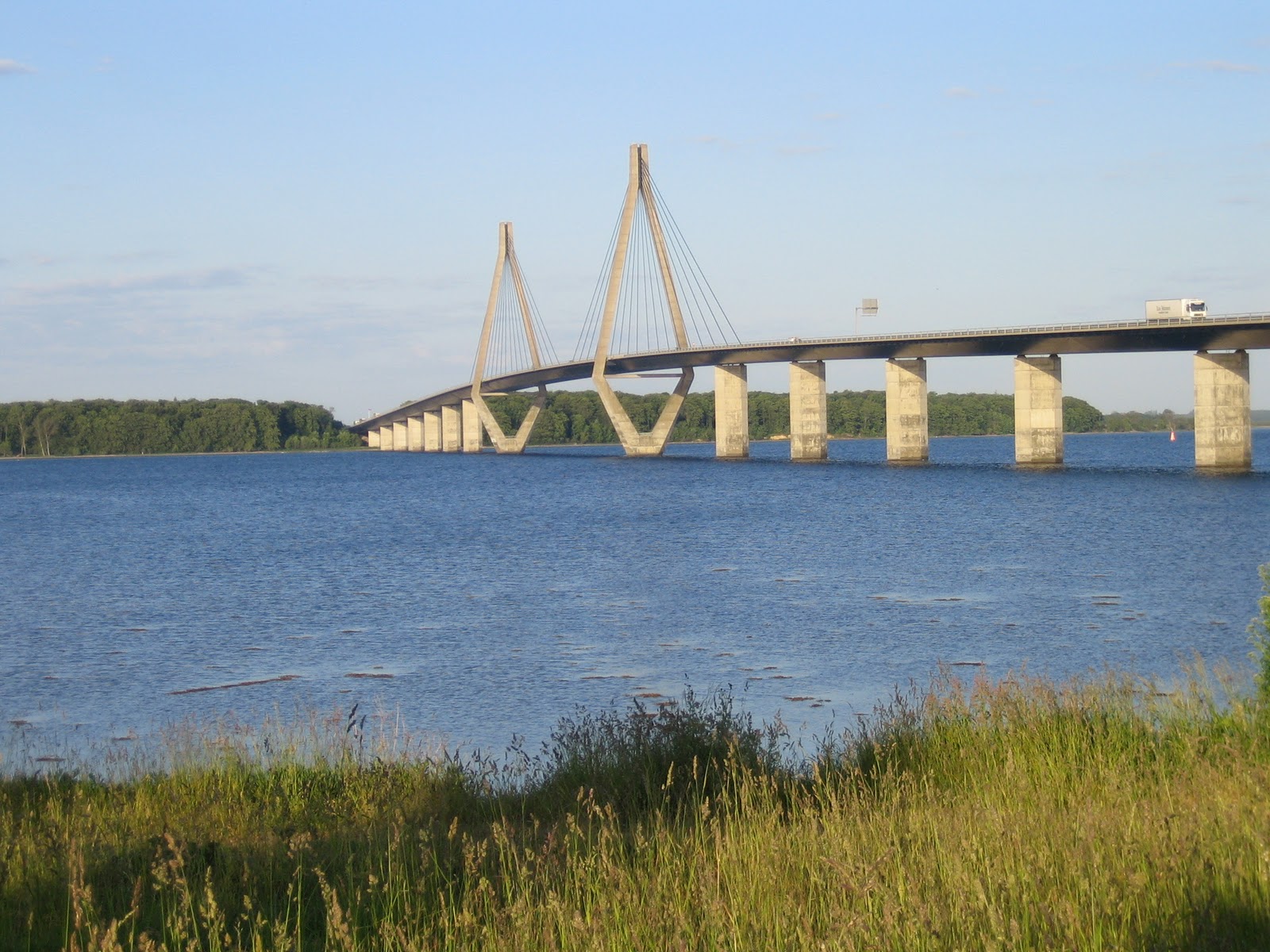 I natt kommer vi att dra i handbromsen vid Farö, cirka 6 mil norr om Puttgarden i Dannmark. Här är en bra ställplats och vi har övernattat här förrut. Man står parkerad, nästan under vägen, som går högt däruppe på en bro. Antagligen blir natten kylig men vi behöver inte frysa. Vi har ju varandra!