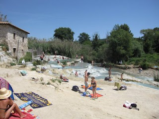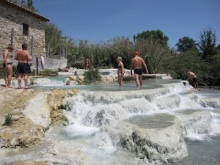 Idag drar vi ur handbromsen och far söderut, till Saturnia. Det är varma källor, med mineralhaltigt vatten. Vi kommer fram strax efter lunch, efter lite krokvägar på den toskanska landsbygden. Det luktar lite ruttna ägg, men inte värre än en surströmmingsburk. Man vänjer sig vid doften efter ett kort tag.