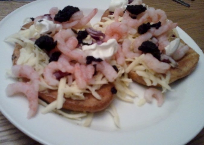 Jag smälte smör och pressade i vitlök. Penslade det på bröden, omgående. Sedan lade jag på riven ost, räkor, klickar av grekisk yoghurt samt lite stebitsrom. Jag fick i mej 2 stycken och blev hur mätt som helst!
