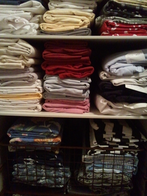 Oj vad fort veckan har gått. Jobba jobba jobba. Man stupar i säng på kvällarna men innan dess ska det handlas, fixas kvällsmat och så ska man ju försöka vara lite social också. En kväll gjorde jag ett ryck och drog ut alltin i linneskåpet. Där var oreda. Ibland var lakanen vikta på tvären. Och ibland var de vikta på länden. Handdukar och örngott huller om buller. Och de extra breda lakanen till husbilens sängar bland torkhanddukarna. Ingen ordning alls, alltså.