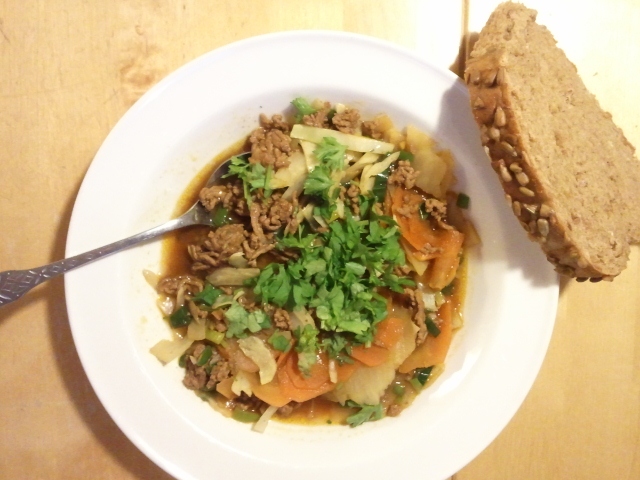 Arbetsdagen försvann i rasande tempo, som vanligt och på bussen hem kopplade jag av med ljudboken i mina öron. När jag klev av vid hållplatsen hemma kom jag att tänka på kvällsmat. Denna evinnerliga källa till frustration och frånvaro av påhitt (och tid…) Nu njöt jag bara av promenaden hem. Kvällsmaten var ju redan fixad. Det har Lina sett till. Jag fick ju första matkassen igår kväll. Så ikväll blev det Nikkaluokta-soppa med ett gott, färskt bröd till. Mycket gott, i en blandning av smaker som jag inte själv hade kunnat komma på. Och mycket blev det, så det hamnar även i matlåda till både mej och gubben.