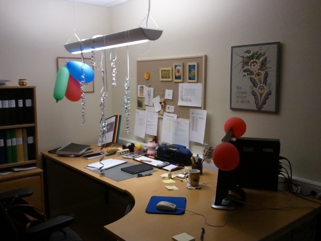 I morse höll mina kollegor på att skrämma slag på mej. Jag möttes först av skylten på dörren.(se ovan) Tänkte tanken att alla gått iväg och tagit kaffe, så jag tog fram mobilen och fotade den fina skylten med ballonger på. Sedan öppnade jag och därinne i skumrasket står alla kollegor och sjunger ”Ja må hon leva” Oj så överraskad jag blev! Hade inte ens tänkt tanken att dom fanns där inne. Efter kaffe och tårta och lite jobbande blev det sedan långbord med smörgåstårta. Vika fina presenter jag fick. Tack!