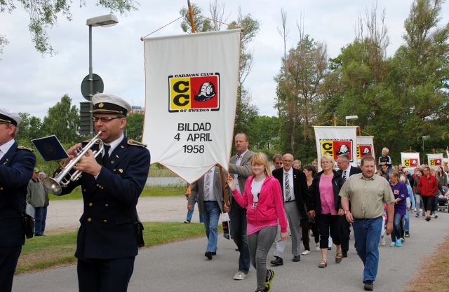 Först gick en blåsorkester och höll takten sedan kom Riks och därefter alla olika sektioner. Som du kan se av bilden är CaravanClub en förening med anor. Den bildades 4 april 1958 och har idag nästan 30000 medlemsfamiljer. Människor som är intresserade av camping och friluftsliv – oberoende om man har husvagn, husbil eller varför inte cykel och tält!
