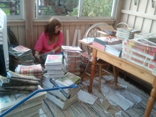 Elin sorterar och paketerar, för att snart åka ut på sin reklam-utdelar-runda