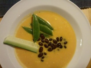 Ta av kastrullen och mixa soppan slät med en stavmixer. Och rör slutligen ner 1 dl creme fraiche. Servera med grönsakerna och gärna ett grovt bröd, tex Äppelbröd.