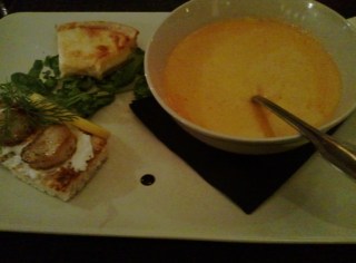 Len Hummersoppa med Cognac, serverad med Västerbottenpaj och smörstekta pilgrimsmusslor på toast med citruscréme.