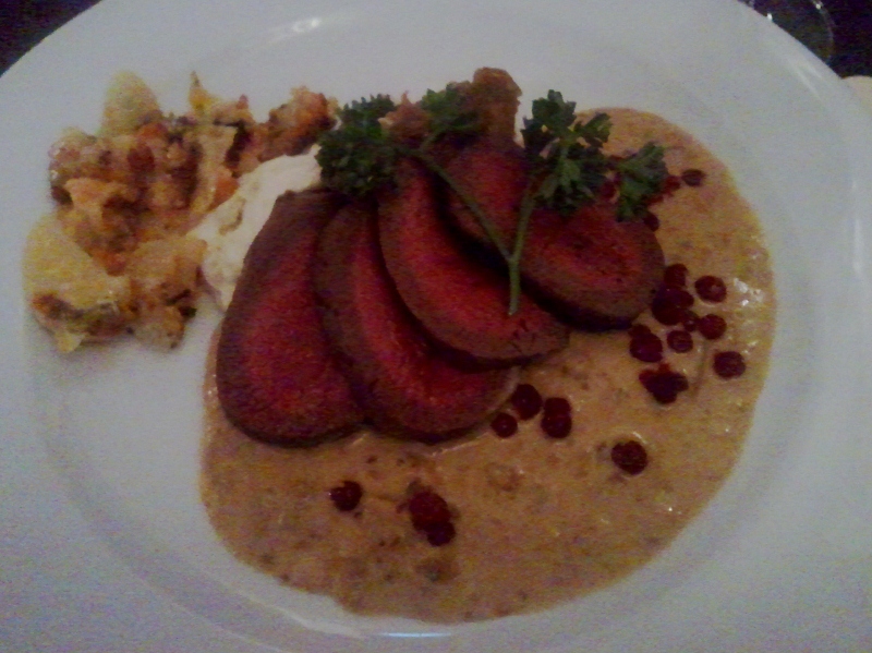 Smörstekt hjortytterfilé med gratäng på sötpotatis serverad med en krämig kantarellsås, hjortroncreme och karamelliserad lök.