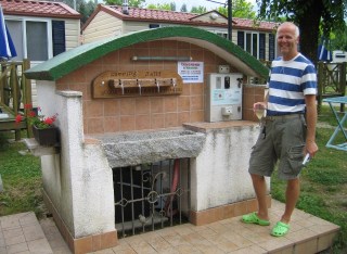 Det har vi aldrig sett så dit måste vi gå. Det visar sig vara en allmän grillplats med bord och bänkar och Vinfontänen, där vi kan stoppa i 4€ och ut kommer rött eller vitt vin eller vatten om man föredrar det, i tappkranar. Vilken kul grej!