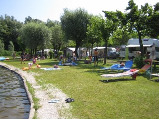 På campingen finns förresten två små butiker som trots sin litenhet har manuell charkdisk och här köper jag den godaste prosciutton jag ätit. De har också färska jordgubbar som smakar härligt. Vill man inte laga mat själv finns en pizzeria. Bada kan vi göra i sjön, eller i någon av poolerna.