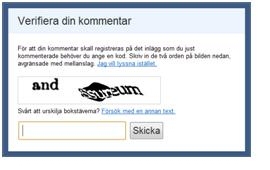 Den senaste tiden har jag hittat och läst långt fler bloggar än jag nånsin trott att jag skulle göra. Det som jag slås av är att så många har har ordkontroll (captcha) på sina bloggar. Det gör det hela lite omständigt att lämna en kommentar och ibland hoppar jag därför över, och struntar i att lämna en kommentar. Har sökt efter information på nätet om det verkligen behövs och isåfall varför, men jag har kommit fram till att det är onödigt.