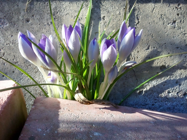 Mot husgrunden, på vårt hus, har jag en stenläggning av tegelstenar och natursten. Men tydligen har det blivit kvar några krokusar trots att jag gjort om i rabatten, Nu har dessa skjutit upp mellan en tegelsten och husgrunden. Så starka, så livskraftiga, så angelägna om att överleva och komma upp i solskenet. Häftigt…