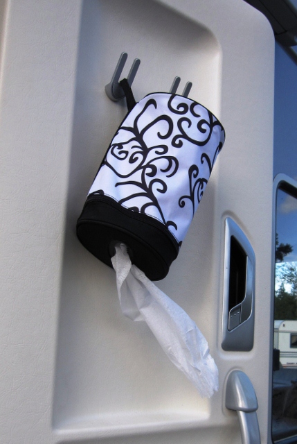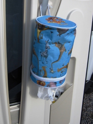 För något år sedan hittade jag en hållare, av kraftigt tyg, till en hushållspappersrulle. Av modell ”Torky” Det är en dragkedja i öppningen, så rullen blir helt innesluten. En hård, taggad springa i botten så det är lätt att riva av pappret i önskad storlek. Upphängningsögglan av kardborre-band är öppningsbar, så den måste inte hänga på en krok. Vår hållare har djuren från filmen Madagaskar, som mönster. men som du ser på nedre bilden( goda vänners rulle) så finns den i olika varianter