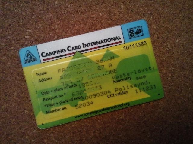 När du tar in på campingplatser utomlands underlättas incheckningen om man har ett Internationellt campingkort. Då slipper du lämna ifrån dej passet, i campingens reception. (Ta förresten kopior på ditt pass och göm nånstans i husbilen) Kortet gäller ett år, innehåller en försäkring och kan även ge vissa rabatter, vilka kan du se här på CCI:s hemsida
