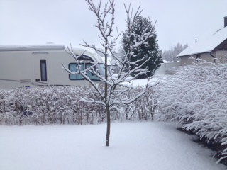 Ja usch vilket väder vi fick idag,inget roligt att se en översnöad husbil hemma på gården här,men