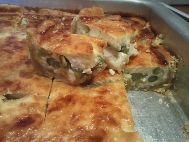 - Fördela osten i pajskalet. Strö ut sparrisen och häll äggblandningen över. Grädda ca 30 minuter mitt i ugnen.