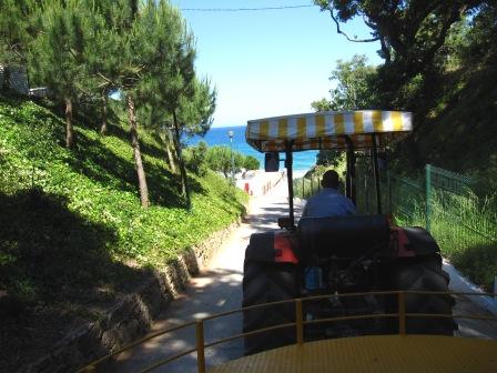 Ner till stranden är det inte så långt men eftersom det är så backigt går det en traktor i skytteltrafik mellan kl 11-16.45.