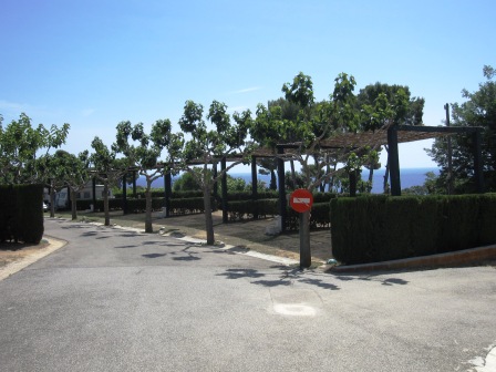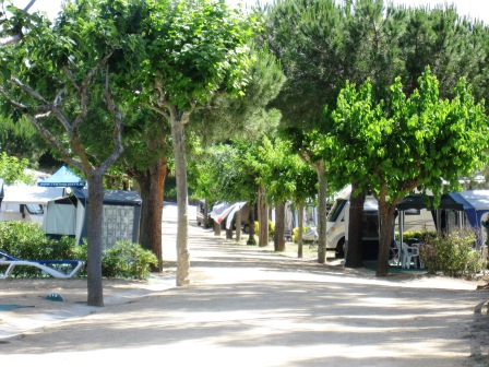 Här i vår rad, finns inga soltak, men lite fler träd. Vi står på en gratis wifi zon alldeles nära receptionen.