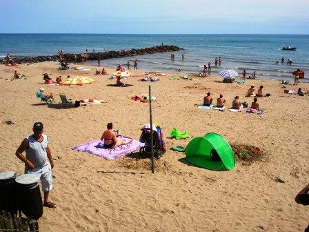 Förmiddagen tillbringade jag på stranden, tillsammans med Tobbe och Kerstin (som vi lyckats lura hit) medan Göran tog sin dagliga morgon-cykeltur. Det var ganska blåsigt men skönt ändå. Sanden är dock väldigt finkornig så den yr omkring väldigt lätt.