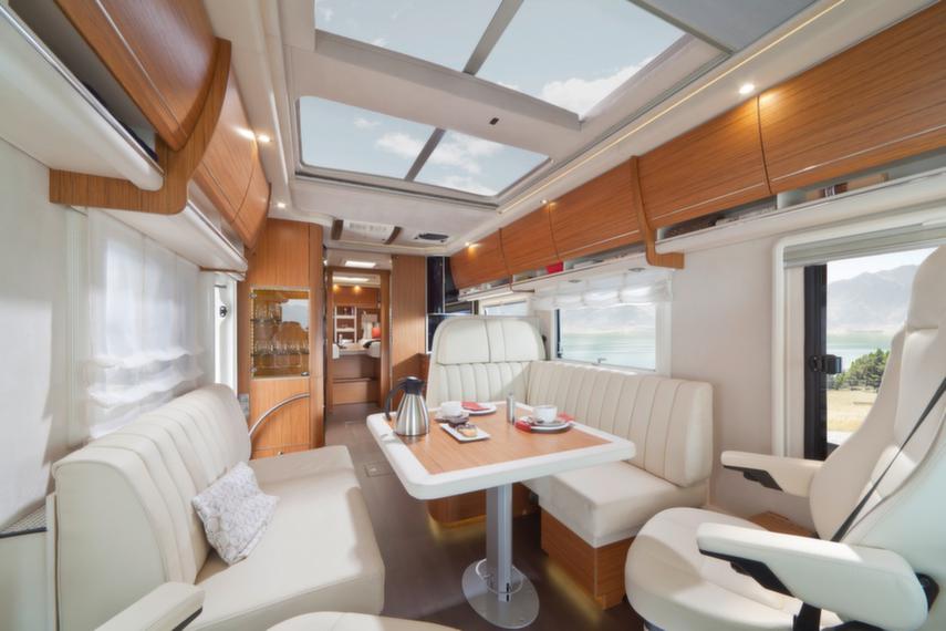 Invändigt har Credo Emotion 831 L en L-formad sittgrupp och ett bord, med plats för fyra. Längst bak finns två sängar i längdriktningen.