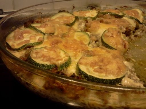 Smörj en form med smör. Och skär och lägg i champinjonerna så de täcker botten av formen. Varva sedan med köttfärs/baconsåsen och bacon och riven ost. Avsluta med den skurna squashen och riven ost på toppen.
