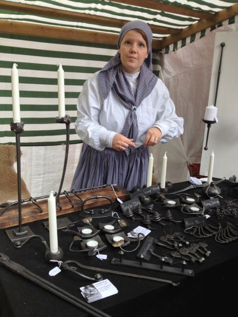 Efter en natt med en del regnskurar gör vi oss färdiga för att kolla runt på marknaden. Som sej bör – på en ”riktig” marknad finns ett område som kallas Gammelmarken. Här finns kolbullar, hantverk, smeder, folkdans och tidsenliga kläder.