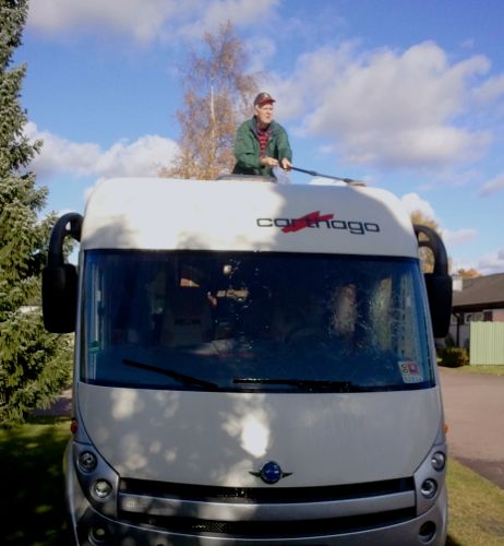 Ibland måste man(nen) ju tvätta och idag kom turen till husbilstaket. Lite småläskigt är det allt när man(nen) är däruppe och klättrar. I och för sej kommer man ju alltid ner – det vet en av våra vänner alldeles för väl…… Nåväl – denna gång hissade han upp sej genom den stora takluckan ovanför dinetten och sedan kröp han omkring och tvättade och vaxade, med Diamantvax. Uppifrån vårt sovrumsfönster kunder jag se resultatet och det blev så fint. Bra jobbat, gubben min 🙂