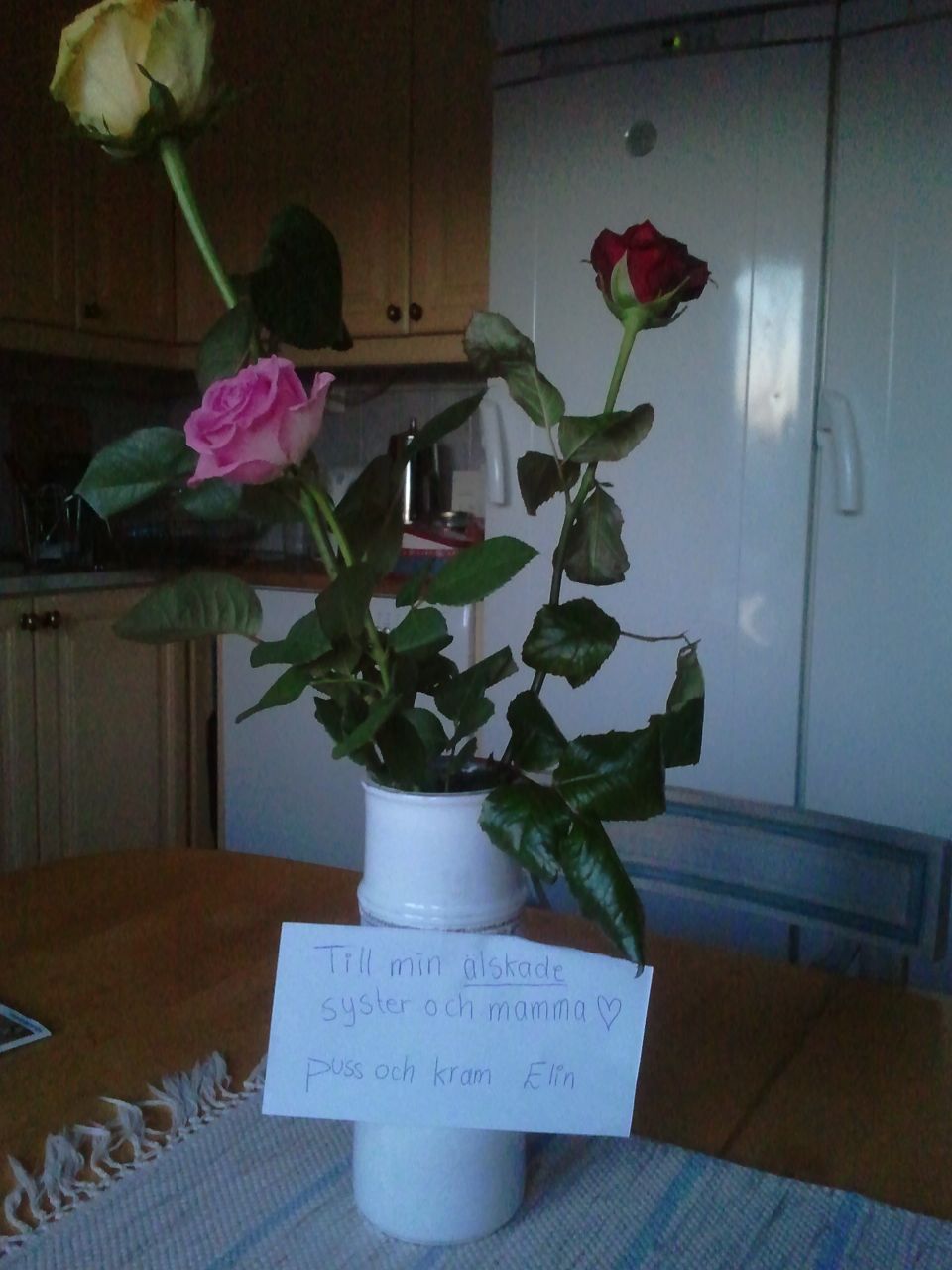Att komma ner till köket och mötas av en klarblå himmel, en sol som formligen väller in, samt några vackra rosor med en underbar liten lapp på, värmer må jag säga! Tack underbara unge!