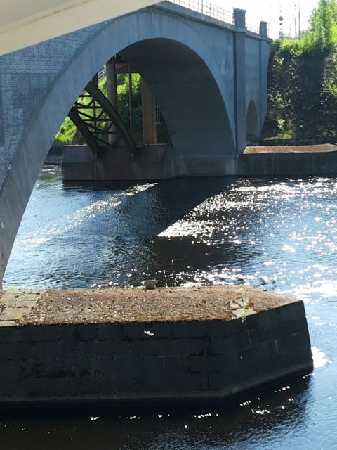 Sedan drog vi ut på geo-caching-tur. Att leta geocacher har legat nere under hela vintern, men idag blev det ett ryck. Det har publicerats många cacher här i stan så nu var det dags att ”beta av några” Här nedan hittade vi en, alldeles bredvid Dalälven.