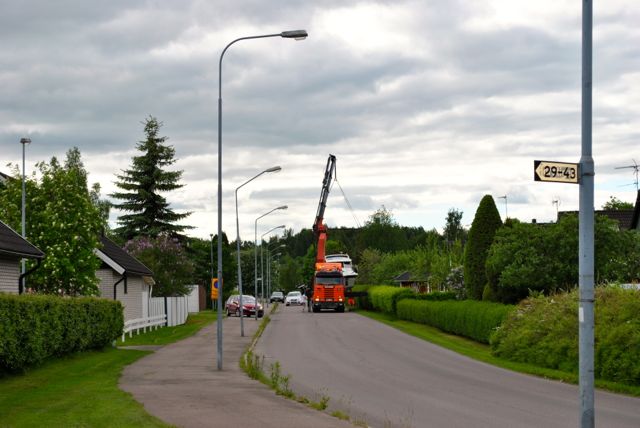 Grannen har ingen husbil. Dom har båt. Idag var det dags för sjösättning. Att se hur kranbilen lyfter hela härligheten över häcken och på flaket, är lite spännande. Kan inte låta bli att tänka – så otroligt smidigt det är med husbil. Bara att packa i det man vill ha med och rulla iväg. I och för sej rullar han också iväg, men bara fram till sjön 😉