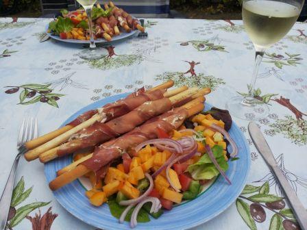 Vi lämnade stranden och gick hem för att laga lunch istället. Idag blev det ”pinnar och sallad” Pinnarna består av Grissini (brödpinnar) Jag tar lufttorkad skinka och på varje skiva brer jag på vitlöksost. Därefter rullar jag skinkan (med osten inåt) runt brödpinnen. Avnjuts med en sallad.