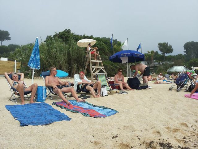 Här har ”vi svenske” parkerat oss, alldeles nedanför badvaktens utkikstorn. Efter en stund så rullade dimman in. Det såg ut som rök som vällde över oss och hela världen blev alldeles grå. Värmen fanns dock kvar men det kändes nästan lite spöklikt.