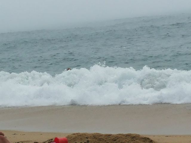 Är det vanligt att dimma kommer in sådär? I några sådan stora vågor skulle inte jag heller våga bada, har väldig respekt för vatten och underströmmar. Håll er på stranden tills havet har lugnat sig.