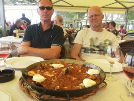 Varmrätten idag var Fideúa. En slags pasta-paella med musslor, bläckfisk, räkor och Aioli. Detta åt vi fjol med och jag har längtat sedan dess. Det går inte och beskriva vad gott jag tycker att detta är, trots att Tobbe och Göran ser lite avvaktande ut. Men jag lovar – hela denna stora panna var uppäten och renskrapad innan vi var klar.
