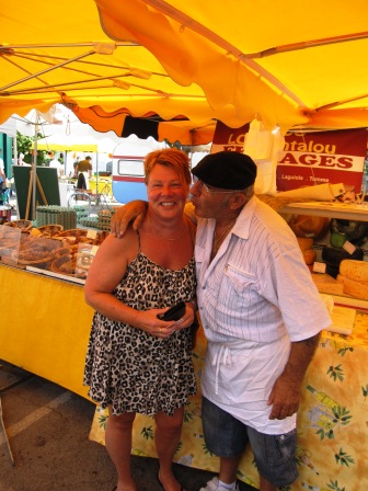 På ett ställe blir vi ”infångade” av en fransos som sålde ostar. Han skar upp det ena smakprovet efter det andra. Han talade på sin smattrande franska och jag försökte med engelska – det gick inget vidare så jag övergick till svenska. Det gick lika dåligt. Efter ett antal ostbitar vi provat, sa jag att vi köper en liten bit. Då kom Göran med kameran. Fransosen sprang in bakom sin disk, hämtade baskern och sedan startade ett rejält pusskalas. Och osten, med paprika och chili i, glömdes nästan bort.