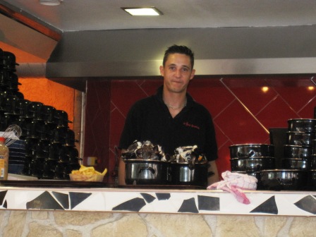 Här står kocken med våra grytor som ska serveras. Pommes i en skål till vänster