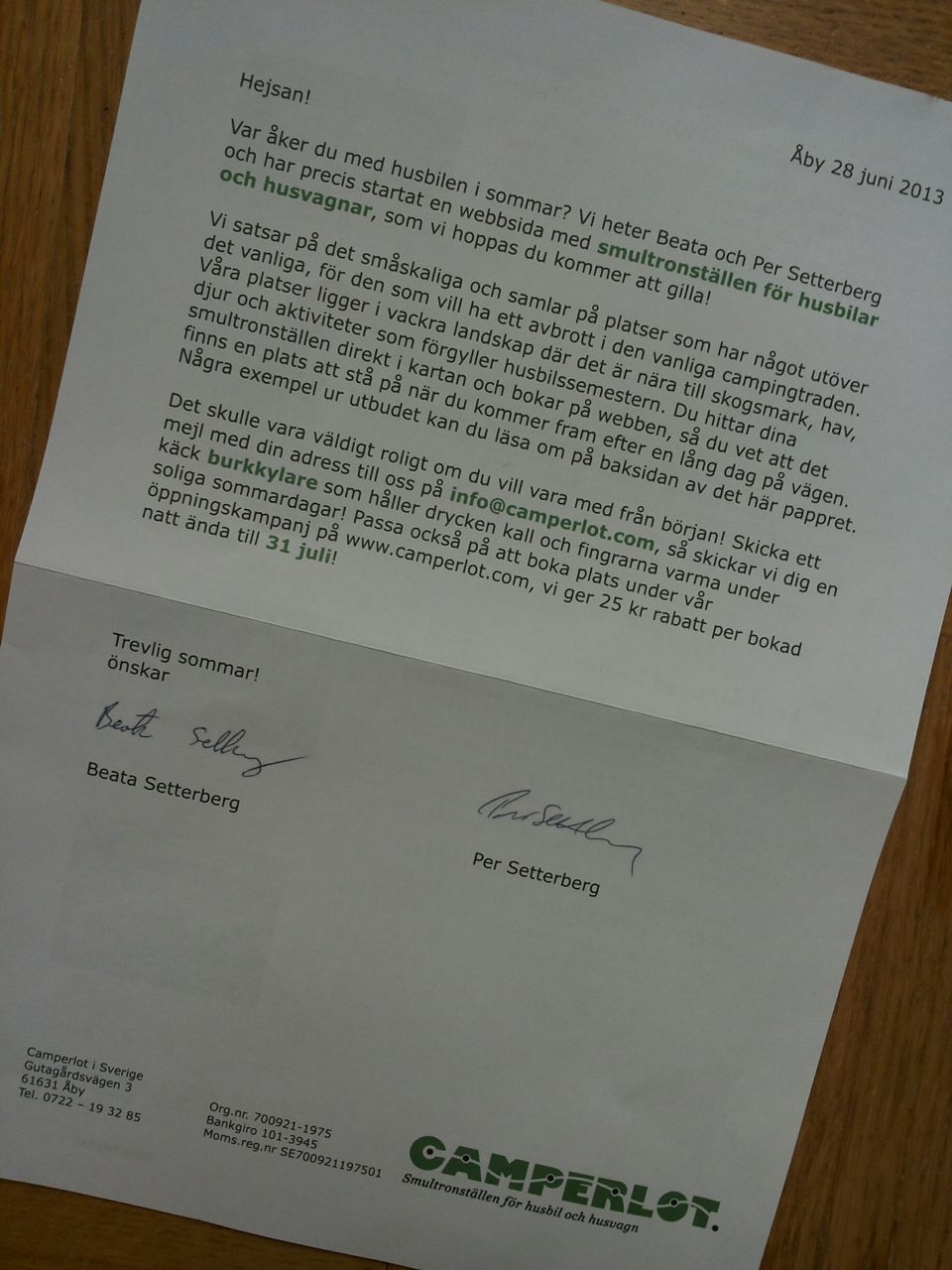 Vi fick också brevet. Jag hade tidigare hittat dem på internet, men enligt mig är det alldeles för dyra ”smultronställen” från 125 – 250:-/natt och ibland finns ingen tömning endast vatten och ev el, Att jämföra med övriga Europas priser som bara är hälften och då finns allt. Håller med om att det är roligare med spontana stopp. Nej, det här är inget för oss men kanske för andra.