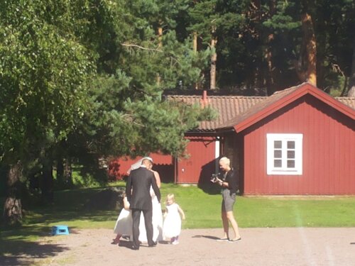 Mitt i händelsernas centrum började bandet, som ska spela på en av bröllopsfesterna, att öva. Vi stod bara 50 m från festlokalen, så det var relativt hög musik. Men bra faktiskt. Sen kom fotografen och brudparet. Då kändes det som om vi var lite väl ”mitt i”