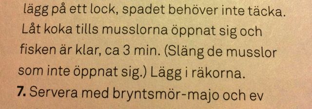 För några dagar sedan ramlade både ICA;s och Coops medlemstidningar in i brevlådan. Först idag hade jag tid att kika i dem och jag blev minst sagt förvirrad. I den ena står om MYTEN att slänga musslor som inte öppnat sej vid kokning. Sedan läser jag ett recept i den andra tidningen och där står SLÄNG musslor som inte öppnat sej vid kokning. Vad i allsin dar ska jag göra med mina musslor?!?