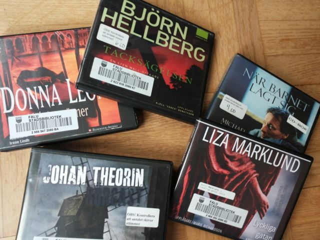 En sån här grå hemmahelg måste man ju hitta på nåt att pyssla med. Därför fick biblioteket ett besök. Flera ljudböcker lånades. Så idag rippar jag dem till datorn, så är semesterns ”ljudboks-kvot” fylld Att lyssna på ljudböcker är något som både jag och käre maken gjort under många år. Vi kanske blir lite osociala, när vi sitter med varsin mp3-spelare, men i en solstol är detta helt perfekt. Jag kan sitta och blunda och behöver inte hålla upp armarna och kisa mot solen. Det största bekymret jag har då, är att flytta på öronsnäcke-sladden emellanåt, så jag inte får ett vitt streck nånstans 😉