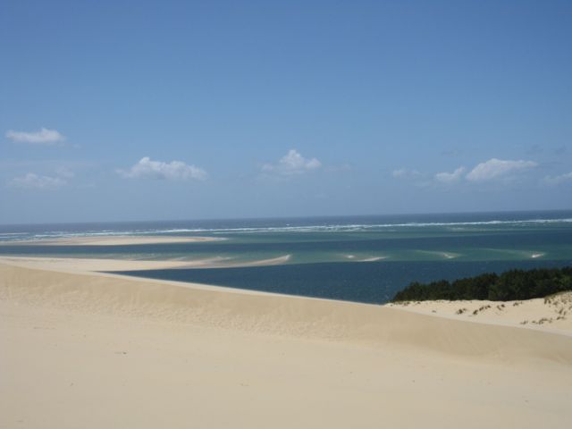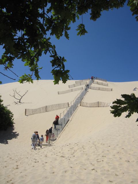 Vi fortsätter söderut mot Bordeaux och staden Arcachon. Strax söder om Arcachon ligger Dune De Pilat. En sanddyn som är hur hög som helst! Vi tar alla trapporna upp. Där uppe får vi hålla i oss för vinden är inte vind – utan storm. Mina ben känns som om de blivit sandblästrade men det var det värt. Vilken utsikt! Magnifikt!