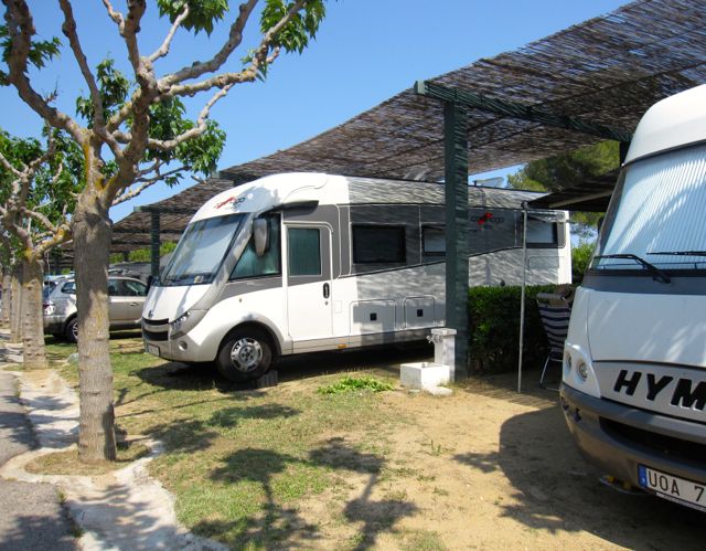 Här är vår plats på camping CalaGogo strax utanför Platja De Aró. Skönt under ett halmtak så vi har inte saknat att inte ha markis på bilen. Närmast kameran står våra goda vänner från Uppsala, som vi träffade just här, för första gången 2010.