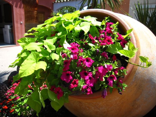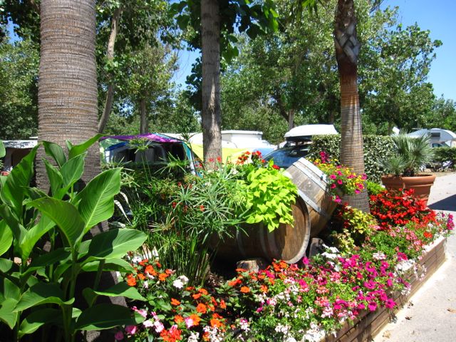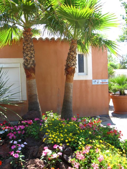 Blomsterprakten på campingen är fantastisk, Häckar av Nerium, fina planteringar och rabatter samt välansade palmer och andra träd.