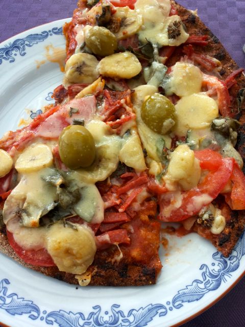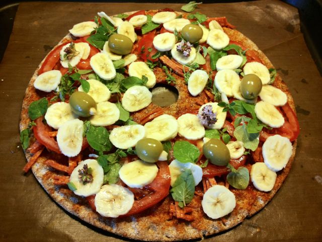 Idag tröt idéerna till sofistikerad kvällsmat. Därför blev det Knäcke-pizza. Snabbt, gott och enkelt. Man tar en en rund knäckebröds-skiva. Blanda lite tomatpuré med olivolja och pensla ut det på knäckeskivan. Sedan lägger man på de pizza tillbehör man är sugen på. In i ugnen i 10 minuter, 200 grader. På min pizza hade jag strimlad salami, färska tomater, en skivad banan, oliver med mandel, färska oregano-blad och riven ost.