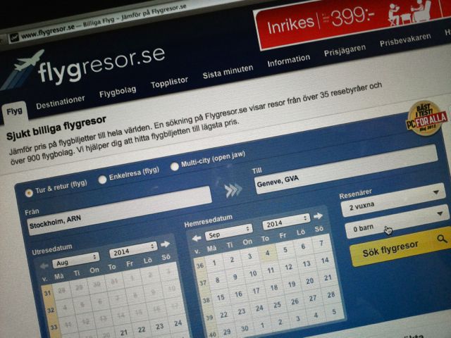 Det är inte helt enkelt att boka flygbiljetter på nätet. Det upptäckte jag igår. Har du provat själv nångång, så vet du vad jag menar…. Vi tänker åka och hälsa på vår dotter Ida som, sedan i augusti, bor strax utanför Geneve. Flygresor.se, Supersavertravel, Budjet.se och allt vad de heter erbjuder sina tjänster.