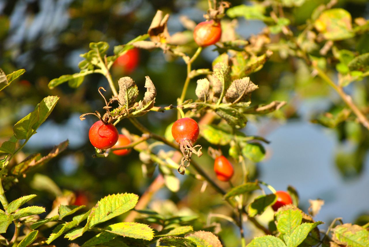 Nyponen lyser röda i solljuset