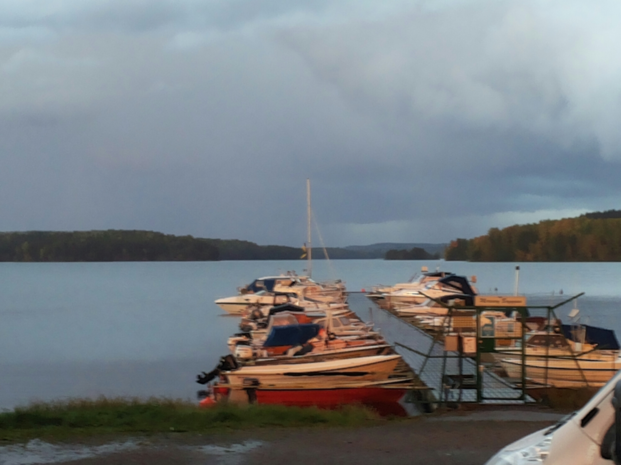 Smedjebackens hamn. Här ligger en hel del båtar kvar i sjön även om många stora har kommit upp på land. Här på ställplatsen är det bara två platser lediga just nu. Och mellan skurarna kikar solen fram. Ställplatsen ligger jättefint precis i småbåtshamnen. I år kostar den 100:-/natt inkl el, toa och dusch. Fyllning och tömning av gråvatten och latrin. I morgon hoppas vi på solsken!