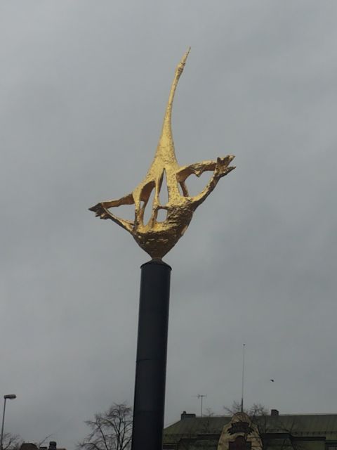 På Hylands Torg finns Tranan – en stor blänkande staty