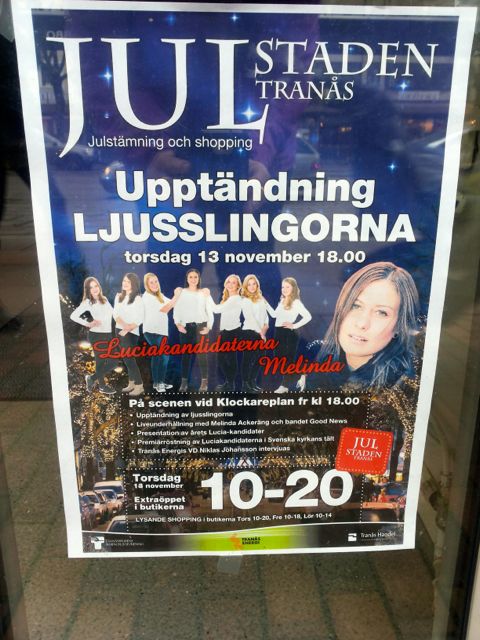 Tranås är ju inte en sån stor stad, men den ger lite mys-känsla ändå. Storgatan med sin långa Boulevard och alla affärer, kaféer och några restauranger som kantar trottoarerna. Trots det gråkalla vädret blev det en cykeltur upp på stan. Bara för att kolla runt lite och kika i affärer. Det har ju bara varit fram och tillbaka till jobbet annars. Kanske med en liten avstickare för att handla lite mat. Kul att se hur stan ser ut i dagsljus. Nja dagsljus och dagsljus…. det är ju som sagt grått och solen lyser med sin frånvaro.