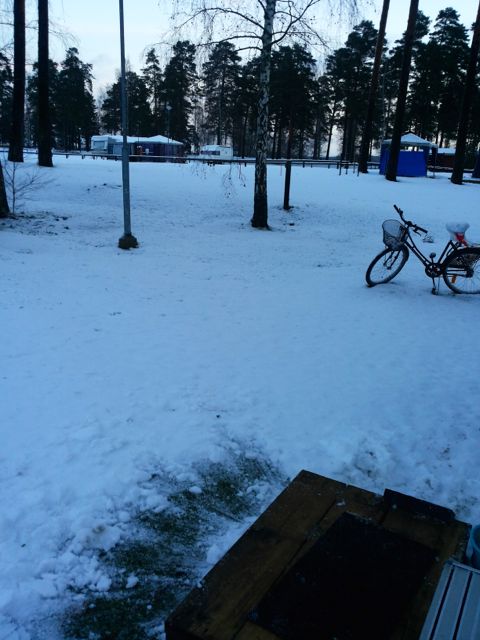 I natt har det ramlat ner en massa snö. Ni vet det där vita som täcker marken och gör den kall. Men ljus. Lite passande att det kom just nu, lagom till lucia. Morgonen i husbilen här på Hätte Camping börjar därför med en vacker luciakonsert på TVn, en kopp kaffe och tända ljus.