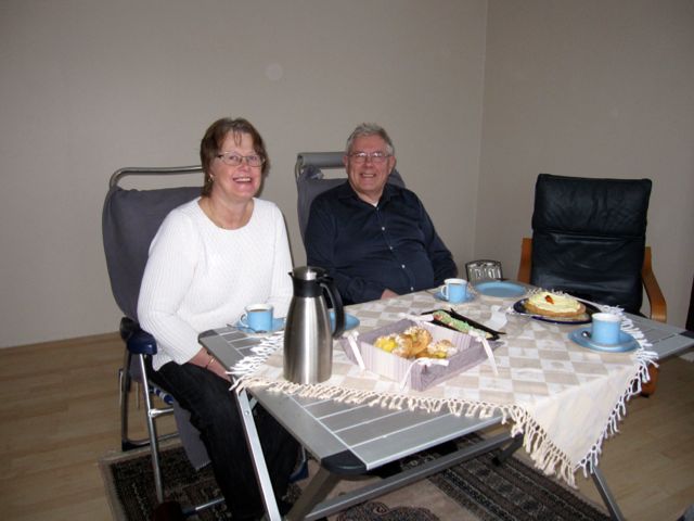 Idag kom det celebert besök. De allra första gästerna som hälsade på i vår nya lägenhet, var bloggvännerna Matts och Birgitta Torebring De hade varit ute på en helgtur och stannade till på en fika när de passerade förbi. Det var jätteroligt att de tog sej tid att stanna till. Eftersom vi inte har hunnit att ta ner så mycket möbler hit till lägenheten, så blev det ”campingfika” vid vårt camping bord, sittandes i våra campingstolar. Och då passade det ju extra bra att det var husbilsvänner som kom 🙂
